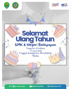 Selamat Ulang Tahun SMKN 6 Balikpapan yang ke-13 🥳 SMK Negeri 6 Balikpapan hadir dan berkarya, mencetak generasi hebat, unggul, dan siap bersaing di dunia kerja maupun dunia usaha. Di usia yang ke-13 ini, semoga SMKN 6 Balikpapan semakin maju,